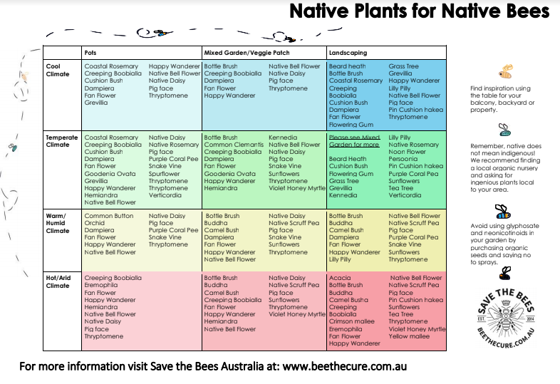 Download your PDF to find native plants that will grow in your climate and your outside area. Anyone can grow native plants for native bees even if you live in an apartment. Remember, Indigenous does not mean native. Consult your local organic nursery for plants indigenous to your local area.
